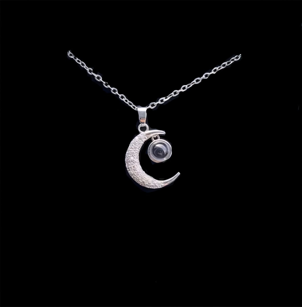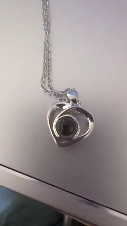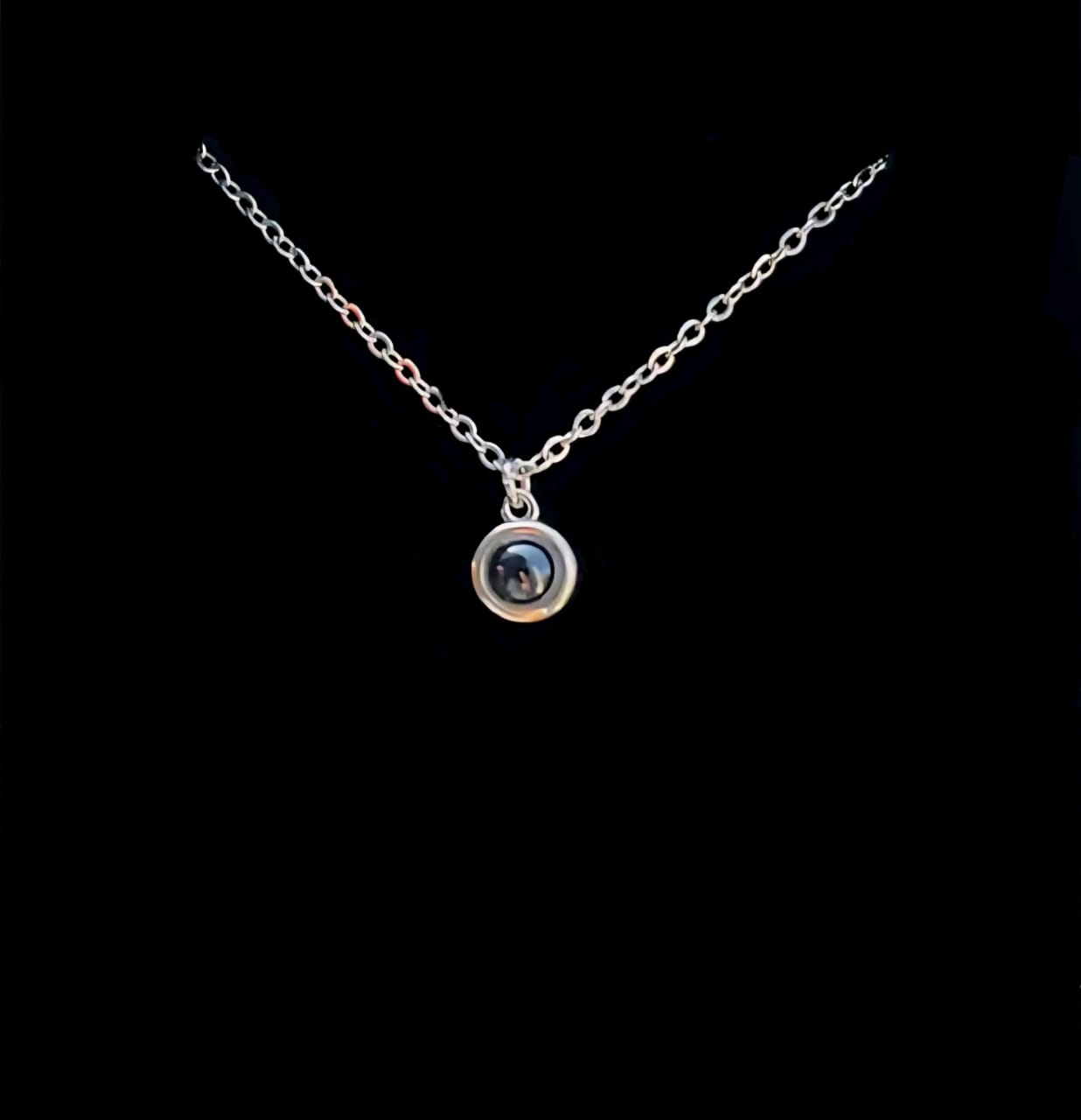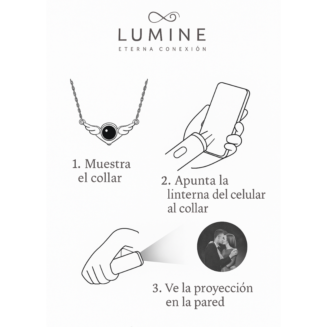 El collar incluye una nano-lente especial que proyecta tu foto cuando iluminas el colgante con la linterna de tu celular. También puedes ver la imagen acercando el colgante al ojo.
