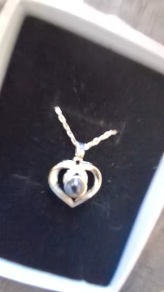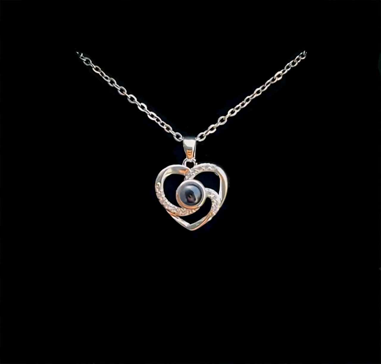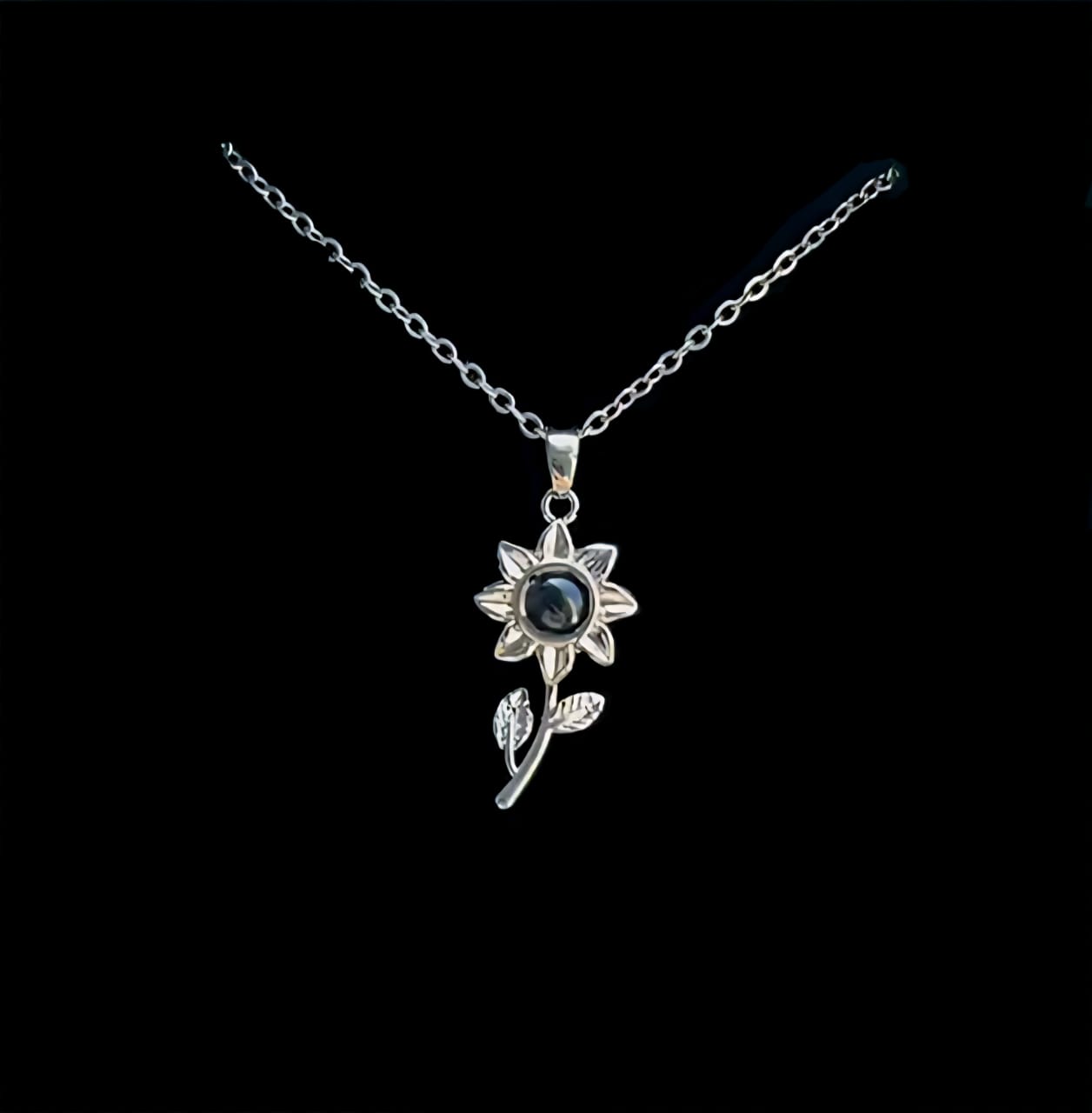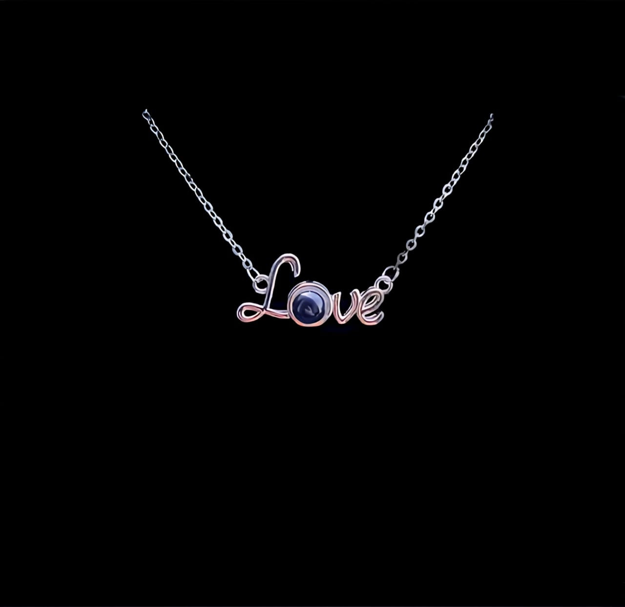 El collar incluye una nano-lente especial que proyecta tu foto cuando iluminas el colgante con la linterna de tu celular. También puedes ver la imagen acercando el colgante al ojo.